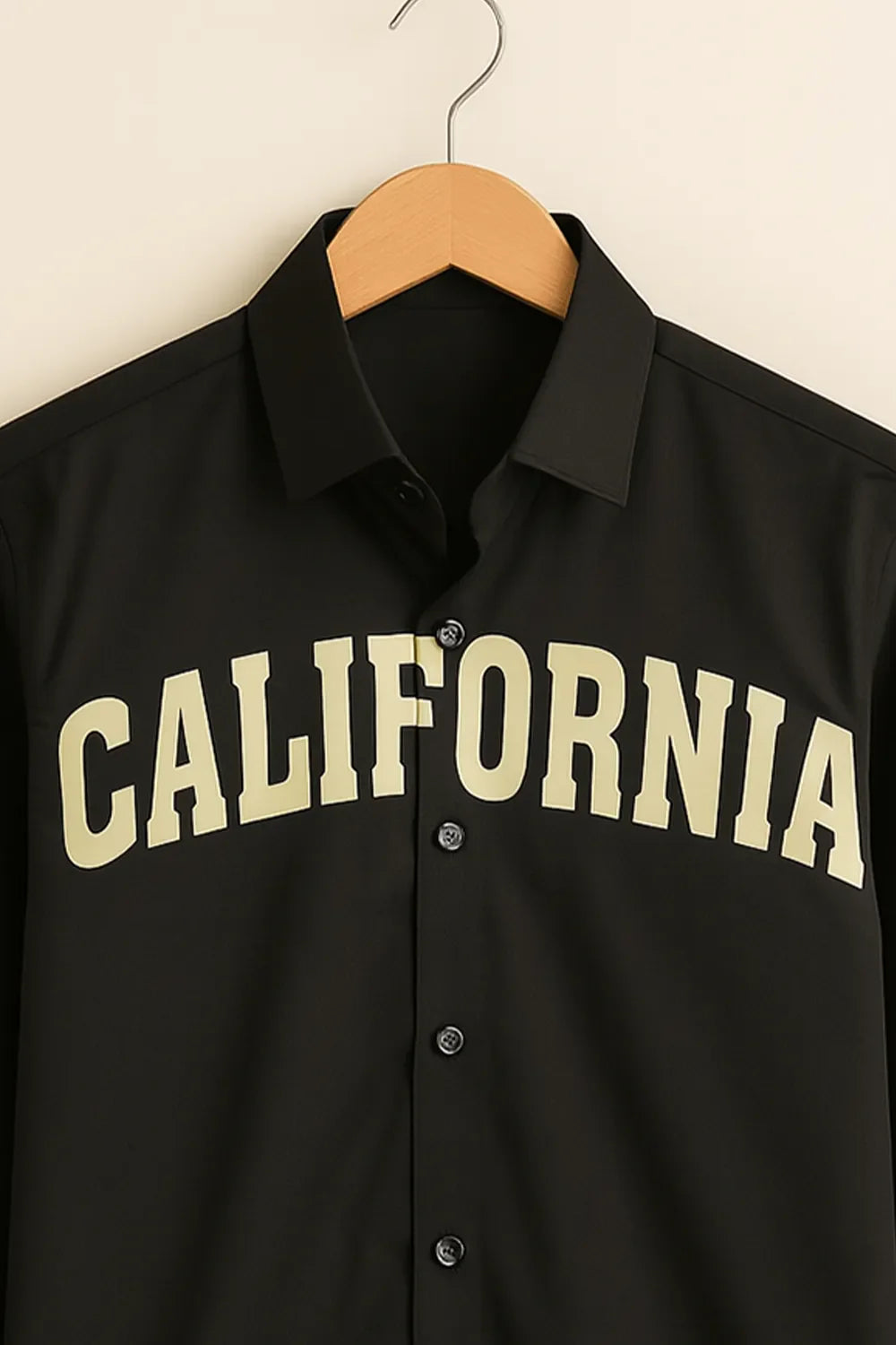 Men's Full Sleeve Cotton Shirt with 'California' Typography Casual Black Streetwear